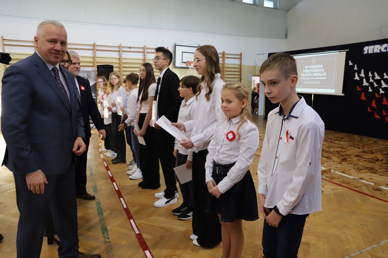 Uroczystość rozpoczęła się od wręczenia przez Prezydenta Miasta Siedlce, pana Tomasza Hapunowicza, stypendiów przyznanych stu siedmiu wyróżniającym się uczniom naszej szkoły.