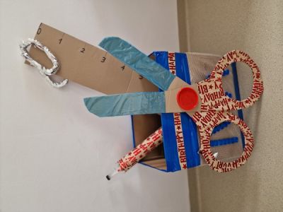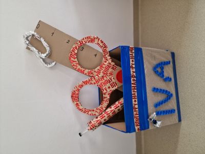 W ekologicznym zestawie znalazły się m.in. nożyczki, ołówek, spinacz biurowy, linijka oraz pudełko na przybory szkolne – wszystko wykonane z pomysłowo wykorzystanych surowców wtórnych!
