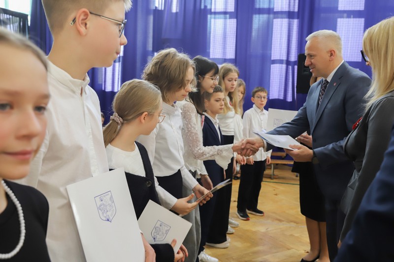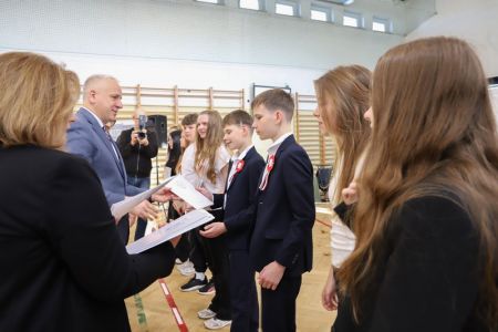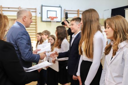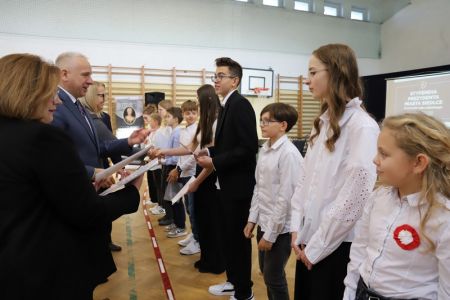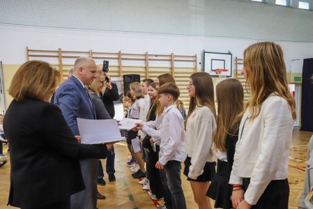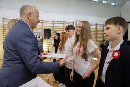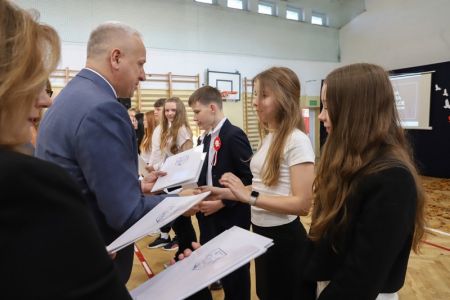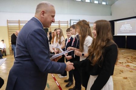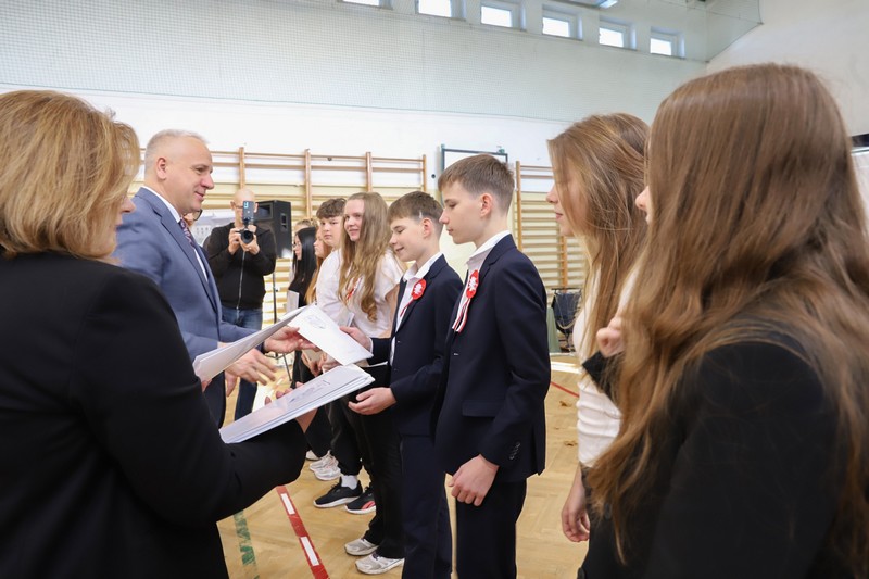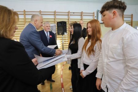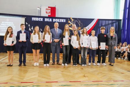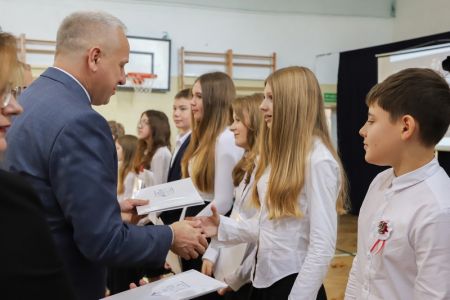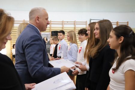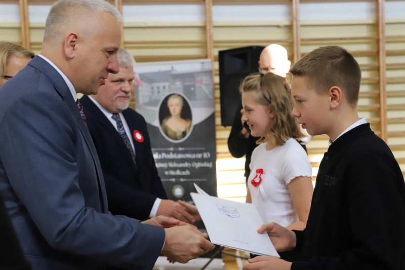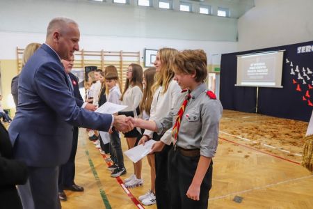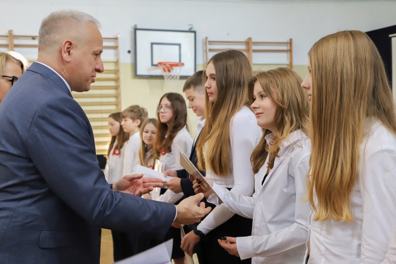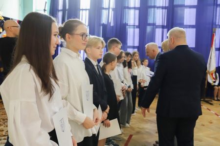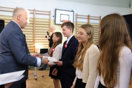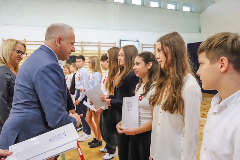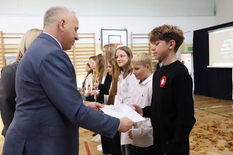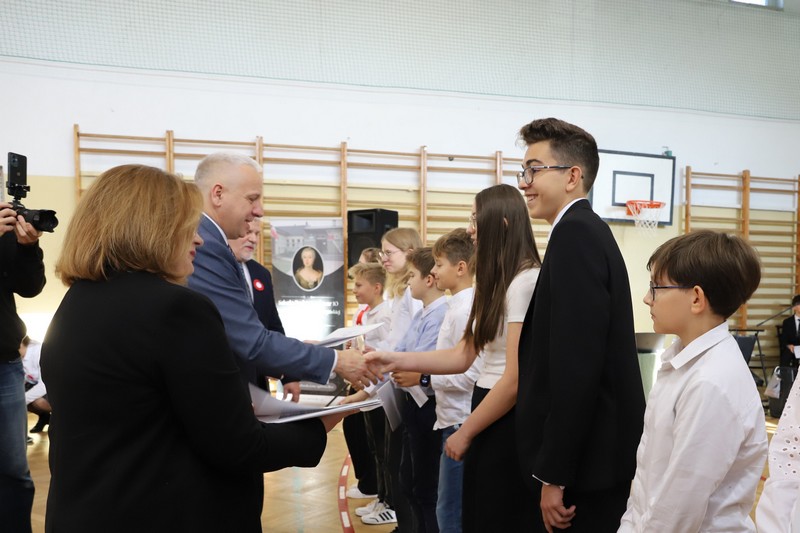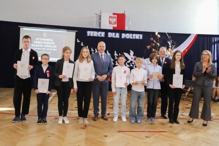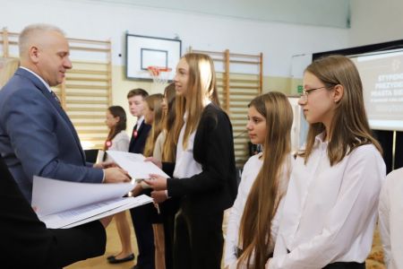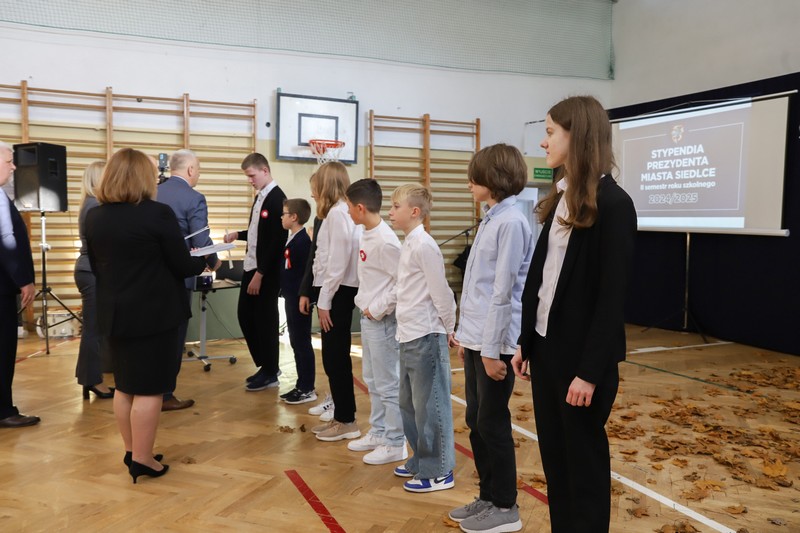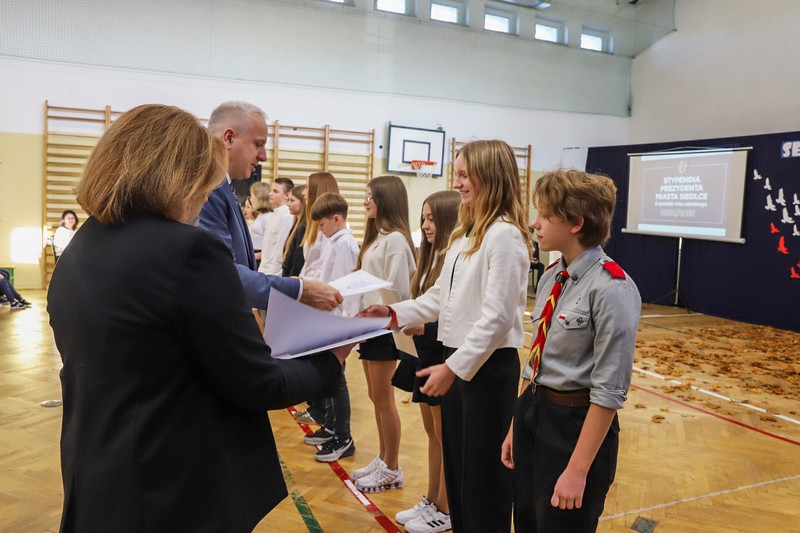 Uroczystość rozpoczęła się od wręczenia przez Prezydenta Miasta Siedlce, pana Tomasza Hapunowicza, stypendiów przyznanych stu siedmiu wyróżniającym się uczniom naszej szkoły.