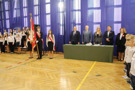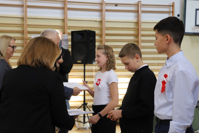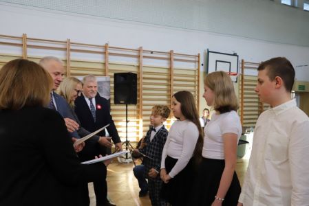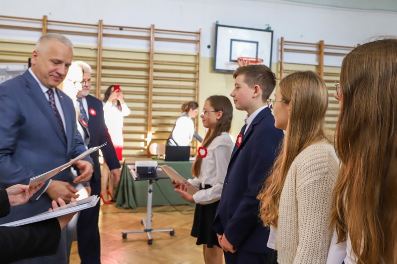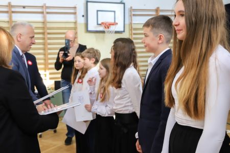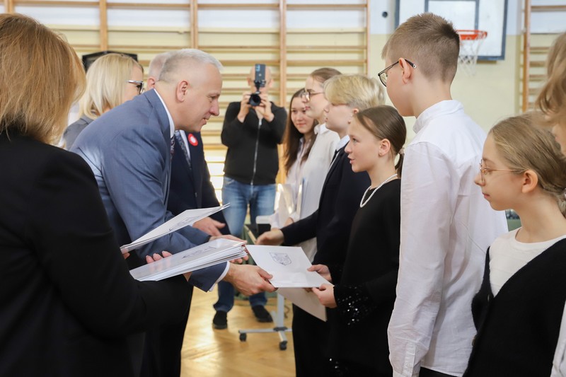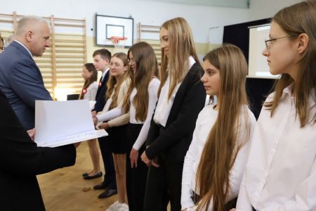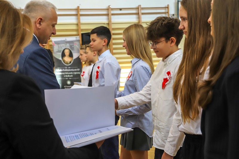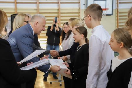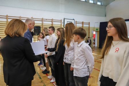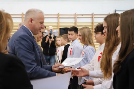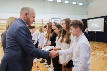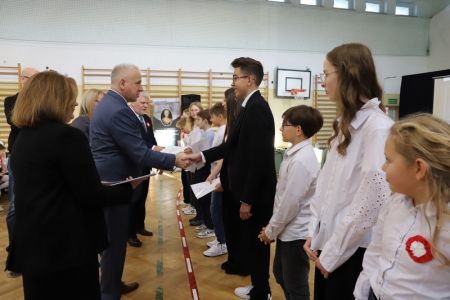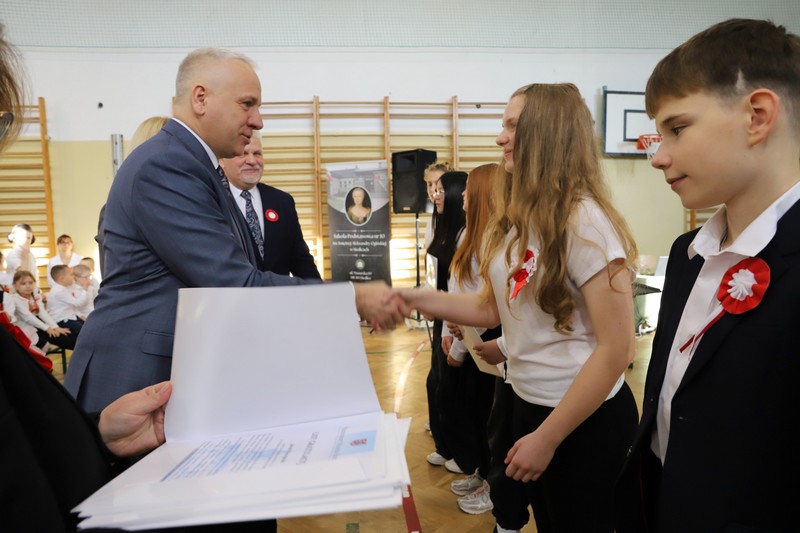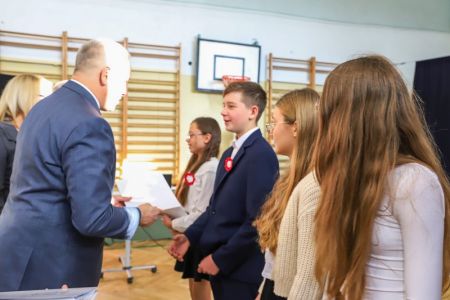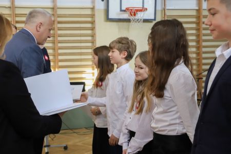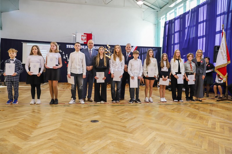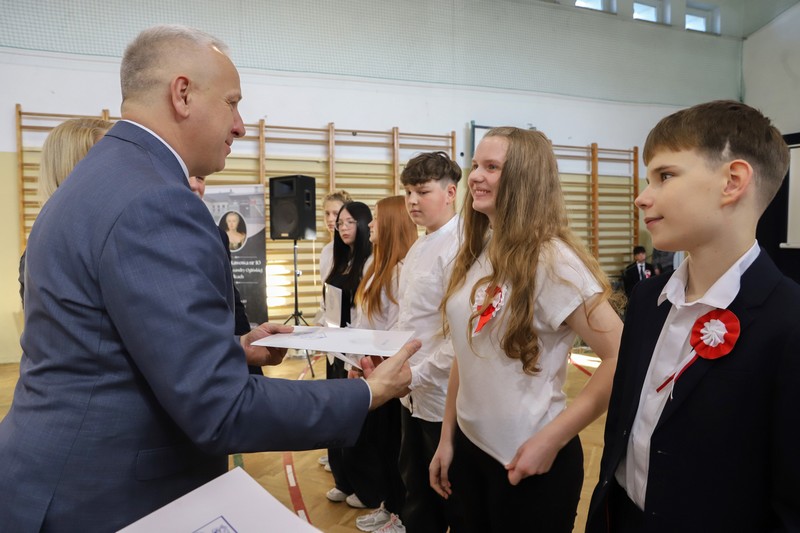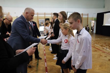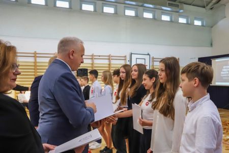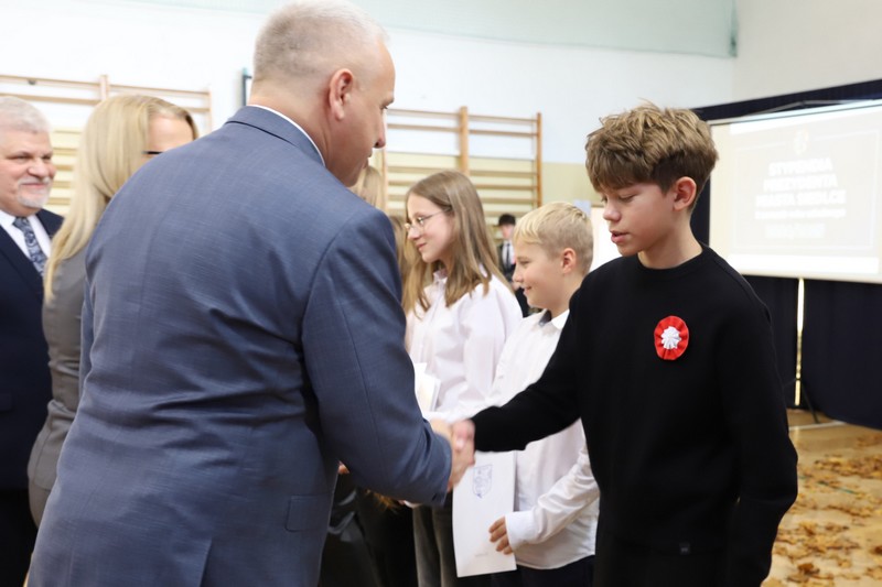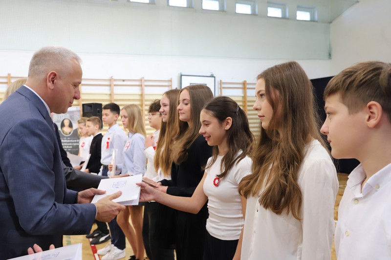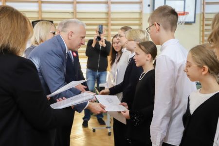 Uroczystość rozpoczęła się od wręczenia przez Prezydenta Miasta Siedlce, pana Tomasza Hapunowicza, stypendiów przyznanych stu siedmiu wyróżniającym się uczniom naszej szkoły.